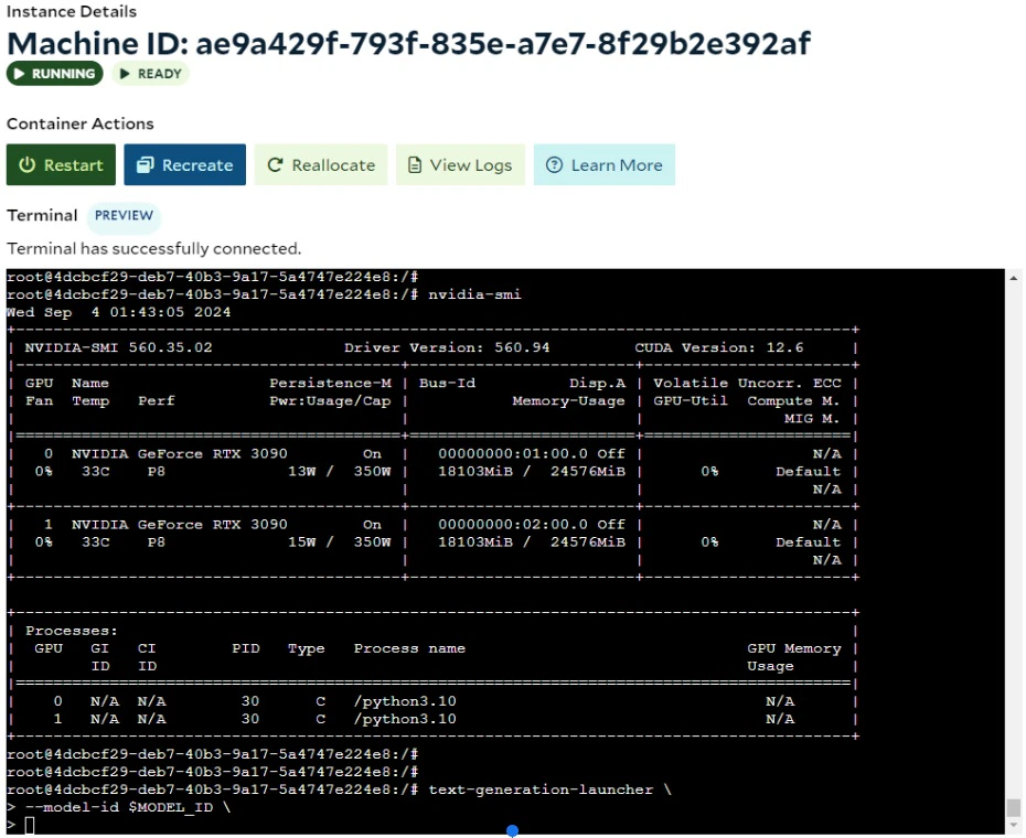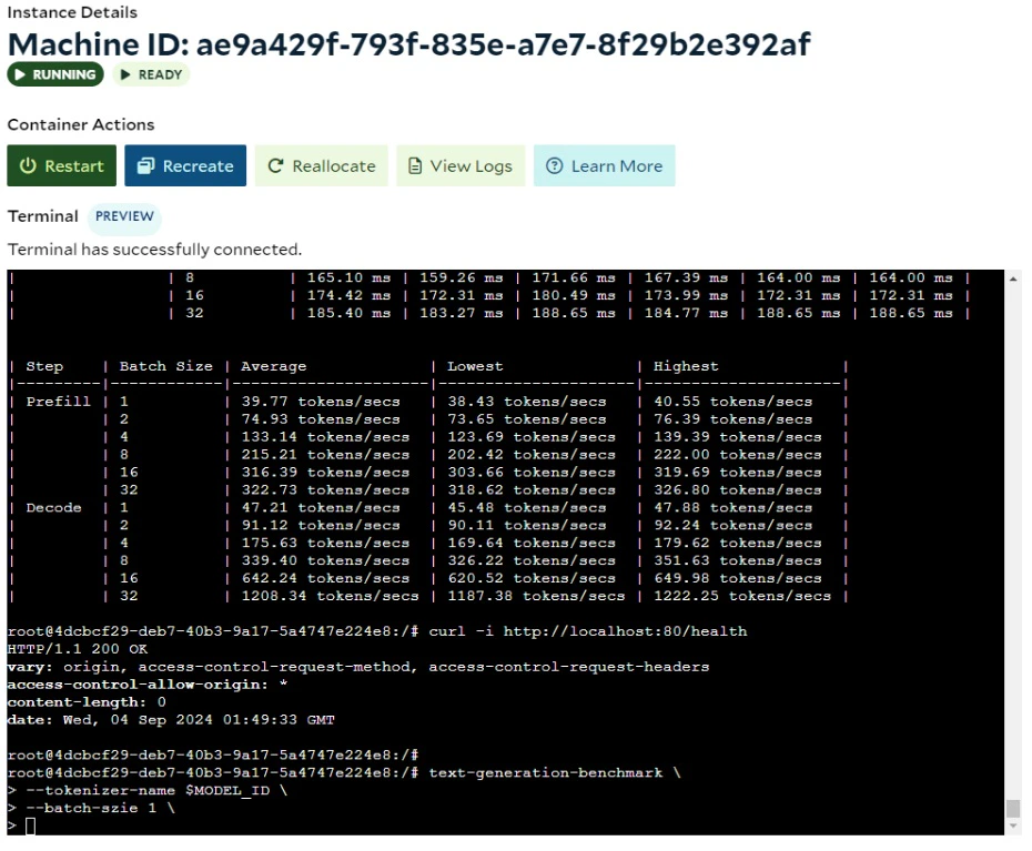 SaladCloud Portal provides an interactive terminal for each instance in SCE deployments, allowing you to interact directly with each instance to troubleshoot issues or reconfigure your application after deployment. If you don’t have access to a local test environment with a GPU, you can use the interactive terminal on SaladCloud to test your image, check its resource usage, fine-tune and finalize server settings. Keep in mind that this is just a complement and cannot fully replace your local R&D environments for daily tasks, as SaladCloud nodes are interruptible and may experience cold starts and occasional downtime.