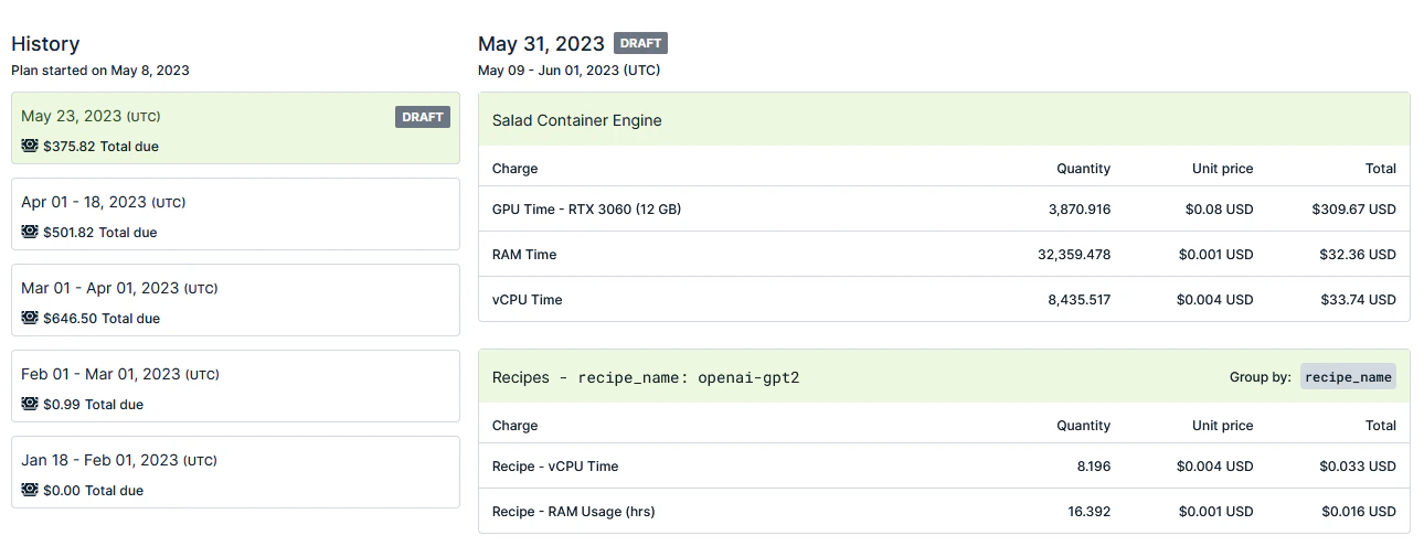 You can monitor the current month’s usage and view previous invoices directly in the SaladCloud Portal.
