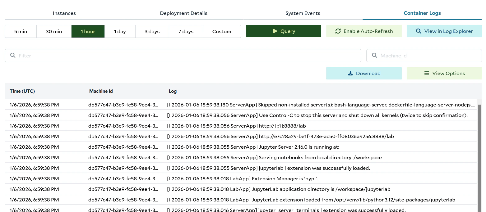- filter for logs from a specific Machine ID. If left blank, logs from all Machine IDs in the Container Group will be returned.