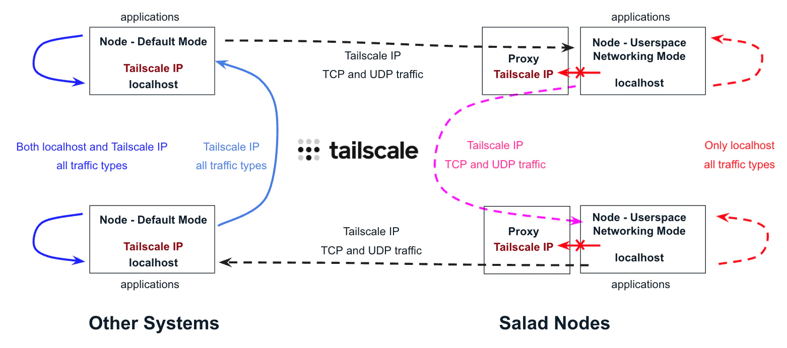 | Source: Userspace Networking Mode (Salad Nodes) | The application can access peers via their Tailscale IPs for TCP and UDP traffic by using the local proxy provided by Tailscale. | The application can access peers via their Tailscale IPs for TCP and UDP traffic by using the local proxy provided by Tailscale. The application can access itself via the localhost (127.0.0.1) for all traffic types, but cannot reach its Tailscale IP. |