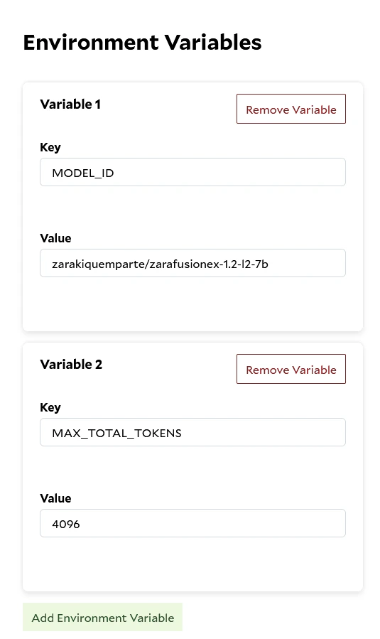 In addition to any options that you need to run the model, you will need to configure TGI to use IPv6 in order to be compatible with SaladCloud’s Container Gateway feature. This is done by simply settingHOSTNAME to ::
