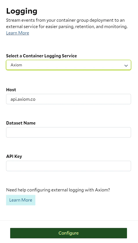 - Once the container is running and logging something, verify that your logs are available in Axiom.