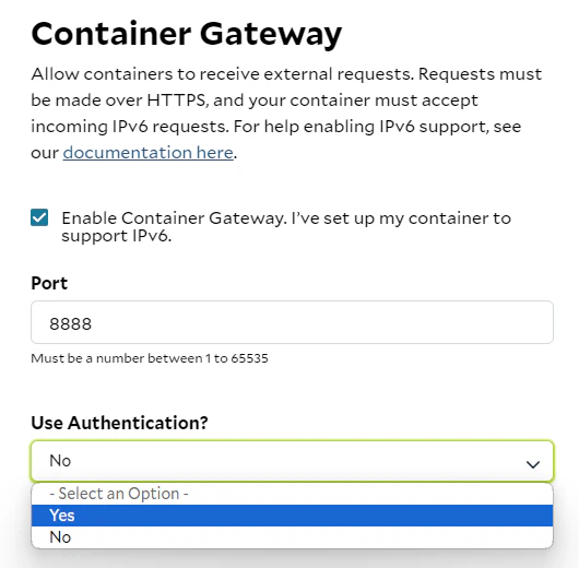 Please note that requiring authenticated networking to the containers is optional, You can choose whether to enable or disable authentication for your containers. However, we recommend implementing your own authentication if you plan not to use ours.