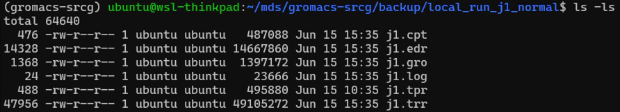 - .cpt – The checkpoint file, updated at configurable intervals (every 15 minutes by default) during the simulation. It allows the simulation to resume from the last saved state after an interruption. While its contents change, the file size remains constant for a given input. A _prev.cpt file may be created to store the previous checkpoint when a new checkpoint is written.