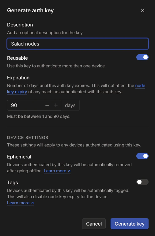 Auth keys allow you to add devices to a tailnet without requiring interactive sign-in through a browser. They’re especially useful for automated workflows, such as spinning up containers or provisioning devices programmatically. You can generate a reusable and ephemeral key for a group of Salad nodes. The ephemeral option is ideal for short-lived, interruptible devices, like Salad nodes, which typically run for a few hours to several days at a time. Tailscale automatically removes ephemeral devices from the tailnet after 30 minutes to 48 hours of inactivity. If the same device comes online again after removal, it will rejoin the tailnet as a new node. An auth key automatically expires after the duration specified at the time of creation, with a maximum of 90 days (which can be adjusted in the Admin Console). Devices added using the expired key remain authorized, but they will require reauthentication once the configured reauthentication interval has passed.