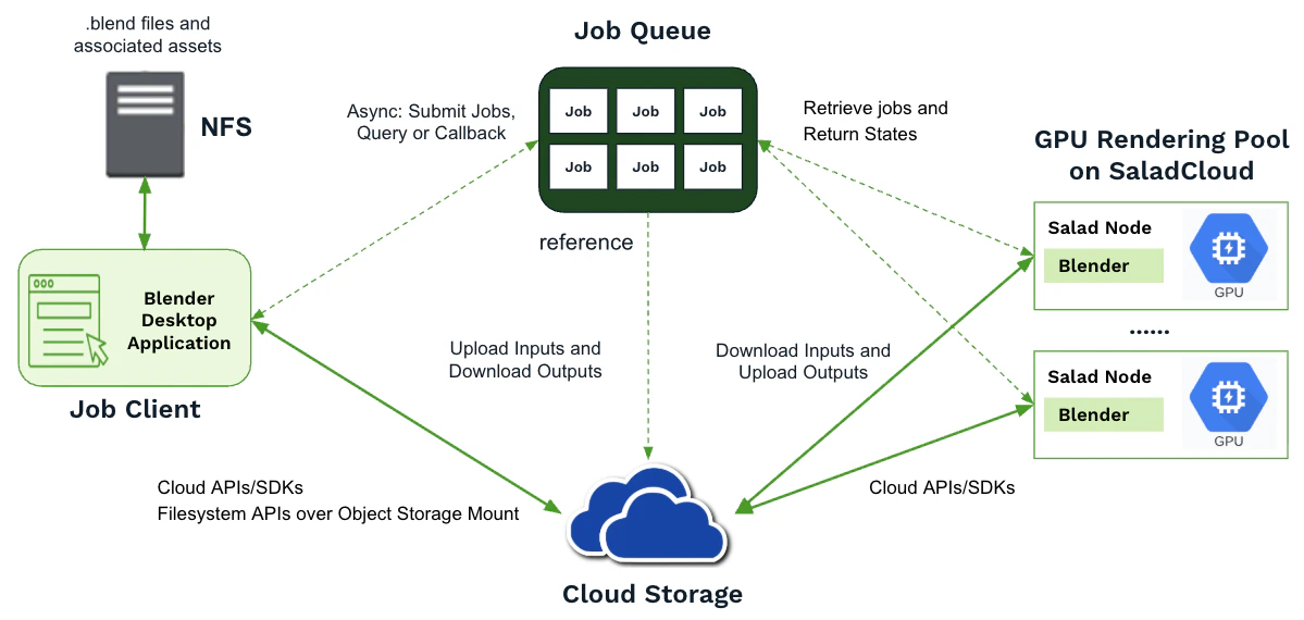 - Option 3 (Recommended): The main .blend file contains references to external dependencies. By parsing the main .blend file and any linked .blend files, we can identify all required dependencies and selectively use them to construct a complete job folder to run Blender. This method allows data to be migrated from the local environment to cloud storage without re-packaging or compression. Once stored in the cloud, assets can be shared across multiple jobs, with each Salad node downloading only the files needed for its specific job. The following sections of this guide focus on this approach.