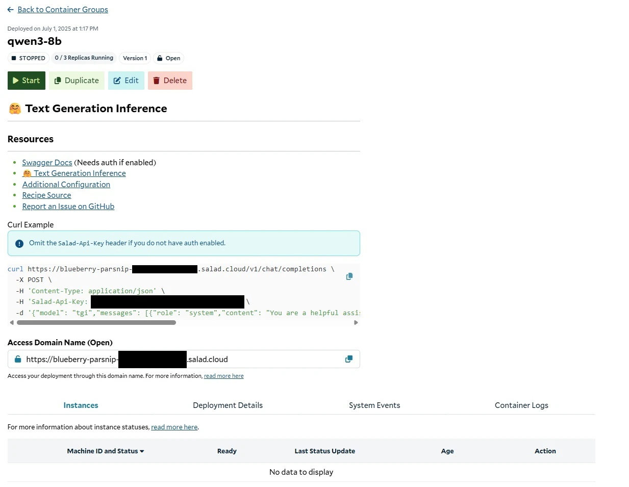 When you deploy the recipe, SaladCloud will find the desired number of qualified nodes, and begin the process of downloading the container image to the host machine. Depending on the preloaded model, the docker image can be quite large (Up to 22GB), and it may take up to tens of minutes to download to some machines, depending on the network conditions of that particular node. Remember, these are residential PCs with residential internet connections, and performance will vary across different nodes. Eventually, you will see instances enter the running state, and show a green checkmark in the “Ready” column, indicating the workload is passing its readiness probe. Once at least 1 instance is running, the container group will be considered running, but for production you will want to wait until an adequate number of nodes have become ready before moving traffic over.