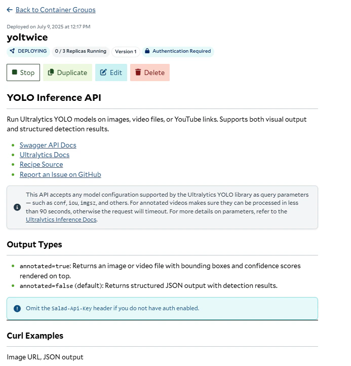 When deploying this recipe, you can optionally enable authentication in the container gateway. If you enable authentication, all requests to your API will need to include your SaladCloud API key in the headerSalad-Api-Key. See