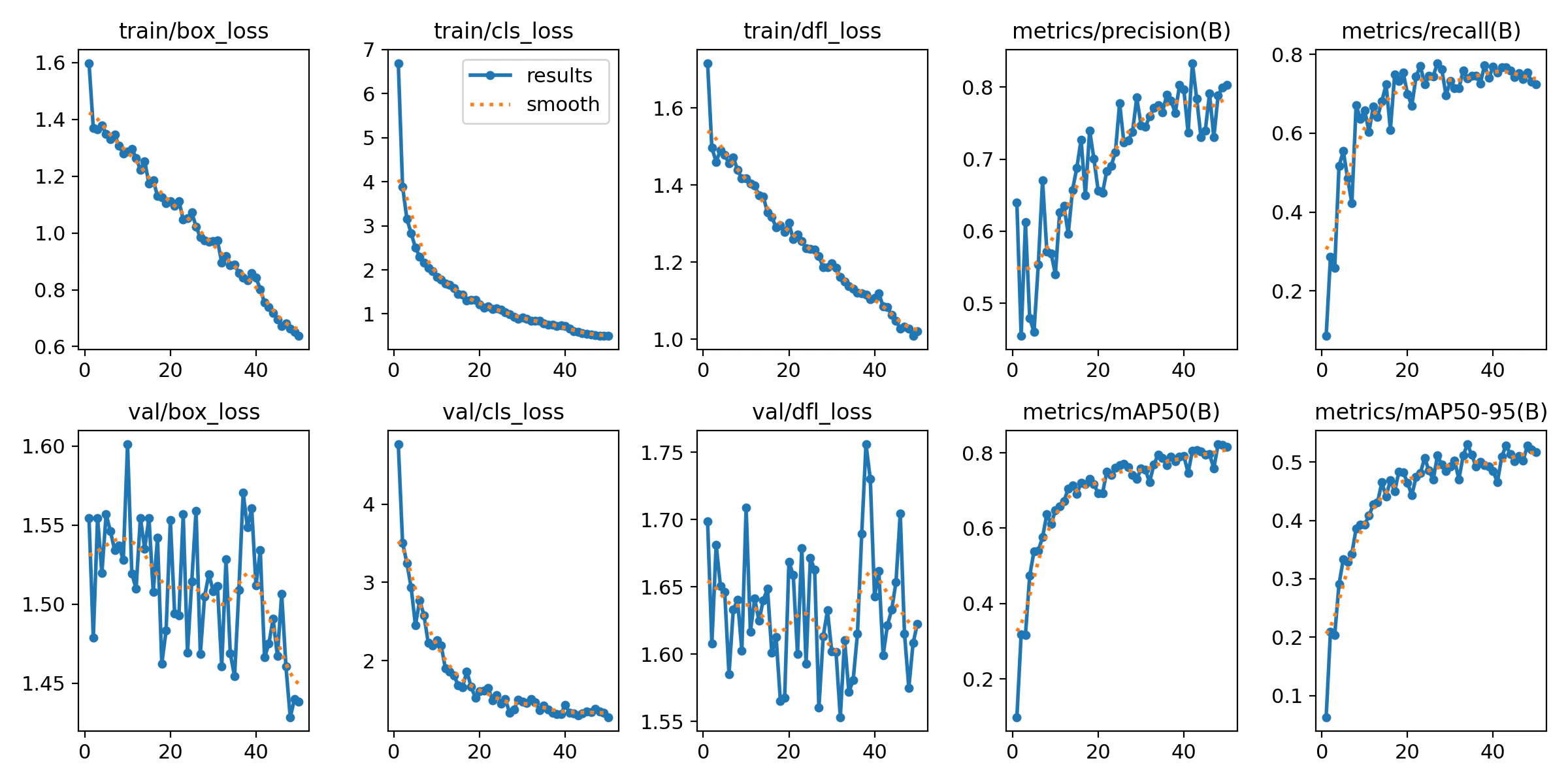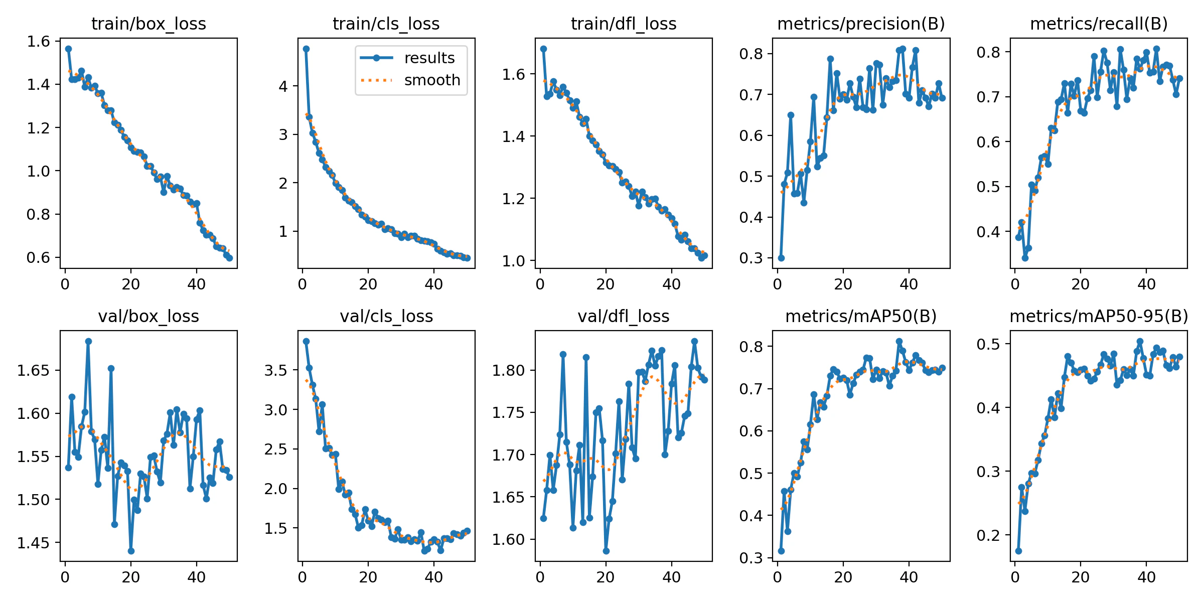 Duration of Training: Training session for the YOLOv8 Small model was completed in about 15 minutes. Trainings Results: