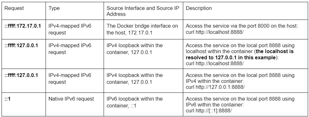 - IPv4-mapped IPv6 requests, coming from the IPv4 address ‘x.x.x.x’ but translated into ‘::ffff:x.x.x.x’ and handled by the same socket.