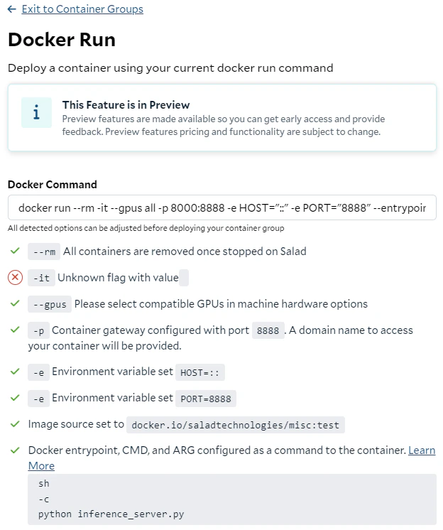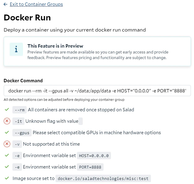 Not all parameters in the docker run command can be directly converted to a container group deployment on SaladCloud; however, alternative solutions are available. The -it flag allows you to interact with a container through a terminal. While SaladCloud does not offer this option during container group creation, you can still interact with running instances using the interactive terminal after the group has been created to perform tests or troubleshoot issues. The -v flag is used to mount a volume by mapping a directory from the host system to the container. SaladCloud currently doesn’t support volume mounting using S3FS, FUSE or NFS. Instead, the recommended solution is to install and use the Cloud Storage SDK or CLI (such as azcopy, aws s3 or gsutil) within the containers to sync data from cloud storage.Start the Container Group