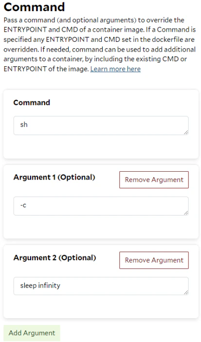 The —entrypoint ‘sh’ and -c ‘python inference_server.py’ options in the command are converted to the Command deployment within the container group. This feature allows you to provide or override the original ENTRYPOINT and CMD instructions specified in the Dockerfile. With this flexibility, you don’t need to modify the Dockerfile, rebuild and push the image every time you change settings and code or run different applications.