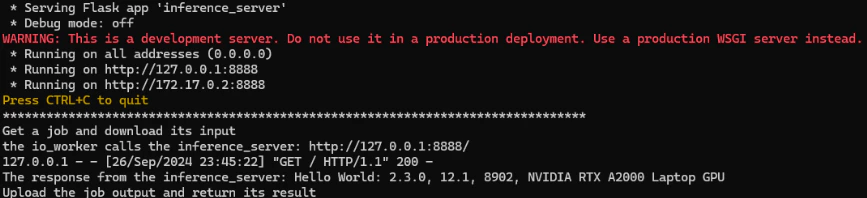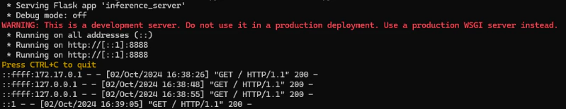 This command provides the ENTRYPOINT instruction ( ‘sh’ ) and overrides the original CMD instruction specified in the Dockerfile ( with -c ‘python inference_server.py’ ) when running the container. The CMD acts as the default parameters for the ENTRYPOINT in this case, and starts only inference_server.py, which handles both IPv4 and IPv6 requests. Additionally, The port 8888 in the container is mapped to port 8000 on the host, enabling any services running on port 8888 within the container to be accessible through port 8000 on the host machine. You can also modify the Dockerfile and rebuild the image to achieve the same goal, eliminating the need to specify the ENTRYPOINT and CMD options when running the docker run command.- Native IPv6 requests, using IPv6 directly and handled by the socket.