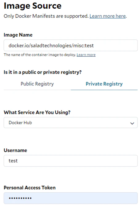 One container group can run only one container image at this moment. Ensure the repository, image name and tag are all correct in the Image Source. If the container image is from a private repository, you will need to provide both the username and access token. These credentials will be used by SaladCloud to pull the image.