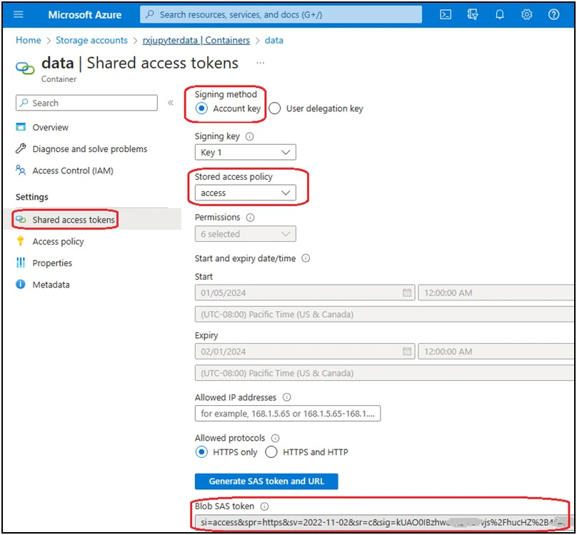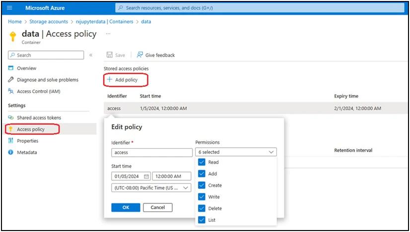 For the access policy, you can define the start time, expiry time and permissions; all the 6 permissions are necessary for the data persistence of JupyterLab containers.