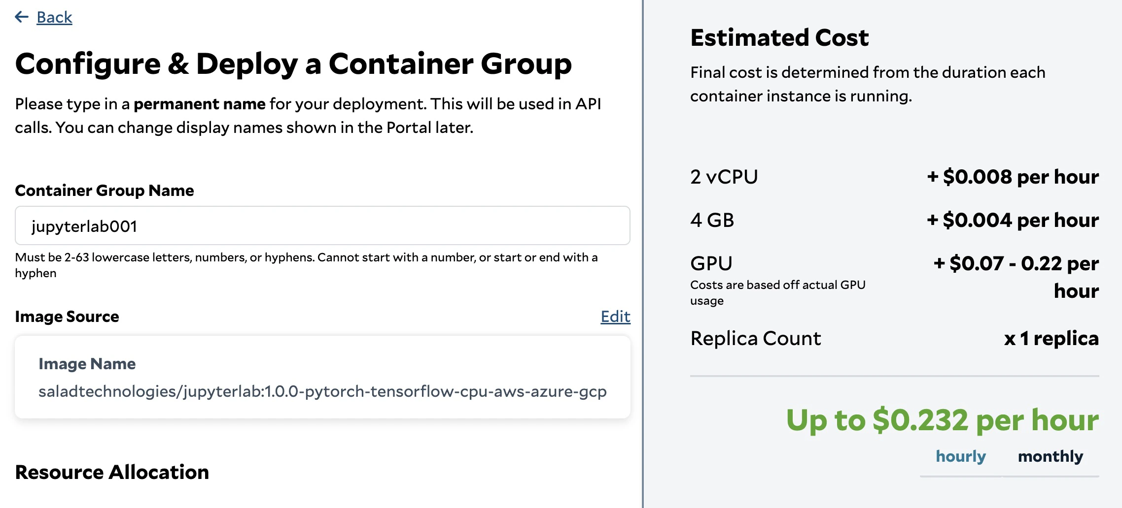 | Image Source | saladtechnologies/jupyterlab:1.0.0-pytorch-tensorflow-cpu-aws-azure-gcp, or your tailored JupyterLab image. |
