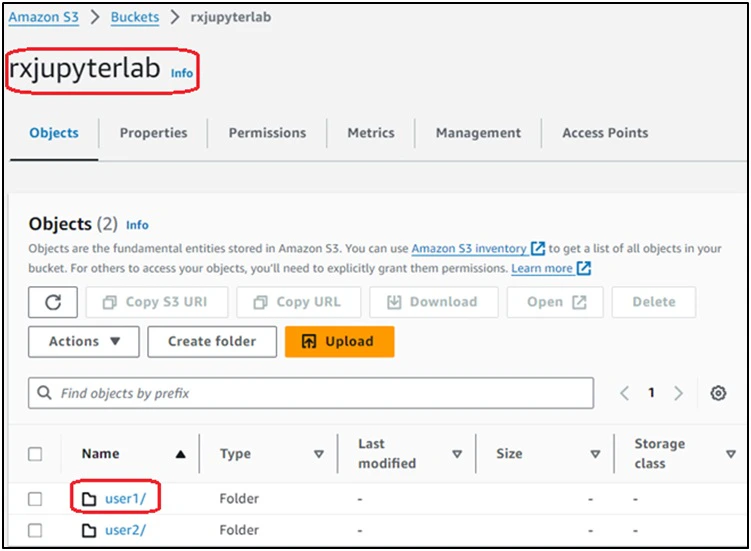 Log into the AWS Console, and create an AWS S3 bucket (‘rxjupyterlab’) with the default settings in one of the AWS Regions, and create a folder named with an AWS IAM username (‘user1’) within the S3 bucket. This folder will be synchronized with the /root/data directory inside a JupyterLab container running on SaladCloud. If an organization is providing the JupyterLab service for numerous users and aims to ensure exclusive access to their own data, creating one folder per user within the same bucket is a recommended approach in AWS.