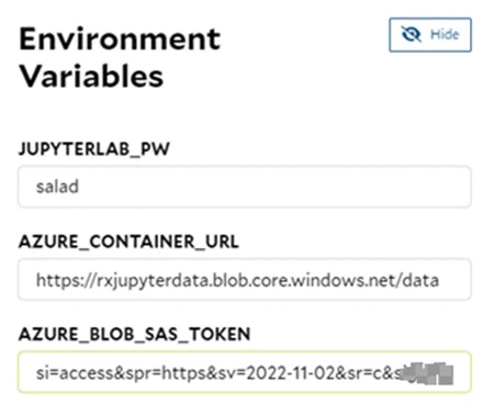 | Environment Variables | Provide the corresponding environment variables based on your needs. JupyterLab Password:JUPYTERLAB_PW; AWS:AWS_ACCESS_KEY_ID,AWS_SECRET_ACCESS_KEY,AWS_S3_BUCKET_FOLDER; Azure:AZURE_CONTAINER_URL,AZURE_BLOB_SAS_TOKEN; GCP:GOOGLE_APPLICATION_CREDENTIALS,GOOGLE_BUCKET_FOLDER,GOOGLE_PROJECT_ID |