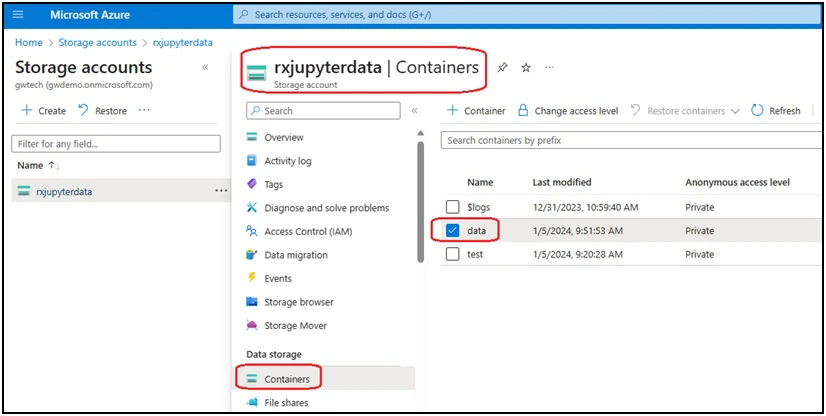 Log into the Azure Console, and create an Azure Storage Account (‘rxjupyterdata’) with the default settings in one of the Azure Regions, and create a container (‘data’) within the storage account. This container will be synchronized with the /root/data directory inside a JupyterLab container running on SaladCloud. If an organization is providing the JupyterLab service for numerous users and aims to ensure exclusive access to their own data, creating one container per user within the same storage account is a recommended approach in Azure.
