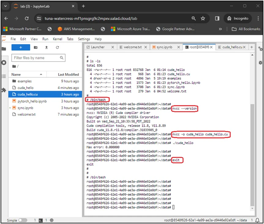 SaladCloud is designed to execute stateless container workloads. To ensure data persistence while using JupyterLab, we leverage storage services from public cloud platforms. The integration with major public cloud platforms, such as AWS, Azure, and GCP, is already implemented into the pre-built JupyterLab container images. Initial setup involves provisioning cloud storage in the chosen cloud platform, followed by using environment variables to pass the storage resource name and its access credentials to the container during launch. We create a folder named ‘data’ within the /root directory of the container, acting as the current working directory that needs the data persistence. During the initial launch of the instance, a script file named ‘start.sh’ is executed, and all data is synchronized from the chosen cloud platform to the /root/data directory by use of Cloud-specific CLIs, the storage resource name and access credentials. Following this, the script continuously monitors the /root/data directory, and any changes (create, delete or modify) in this directory or its subfolders trigger the synchronization back to the cloud.