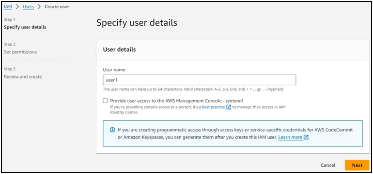 Create an AWS IAM user (‘user1’) without the AWS Console access and attach the customer-managed AWS IAM policy (‘access_its_own_folder’) to the user.