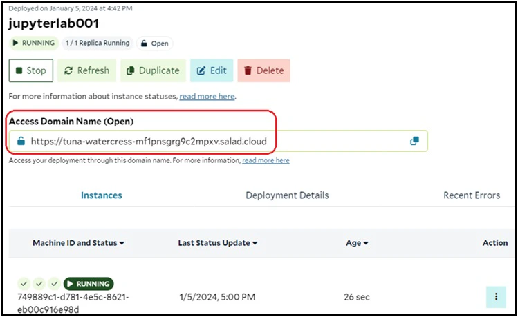 To run a JupyterLab instance on SaladCloud, you can log in the SaladCloud Console and deploy the JupyterLab instance by selecting ‘Deploy a Container Group’ with the following parameters: