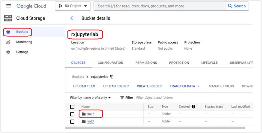 Log into the GCP Console, and create a GCP Cloud Storage bucket (‘rxjupyterlab’) with the default settings in one of the GCP Regions, and create a folder (‘sa1’) within the bucket. This folder will be synchronized with the /root/data directory inside a JupyterLab container running on SaladCloud. If an organization is providing the JupyterLab service for numerous users and aims to ensure exclusive access to their own data, creating one bucket per user is a recommended approach in GCP.
