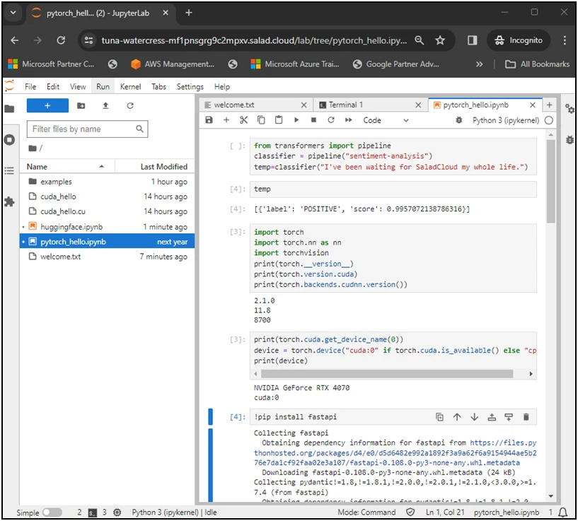 | saladtechnologies/jupyterlab:1.0.0-pytorch-tensorflow-cpu-aws-azure-gcp | JupyterLab; Hugging Face transformers and datasets; AutoAWQ 0.1.6; PyTorch 2.1 GPU; Python 3.10; CUDA 11.8 and cuDNN 8.7; Integration with AWS S3, Azure Storage Account and GCP Cloud Storage |