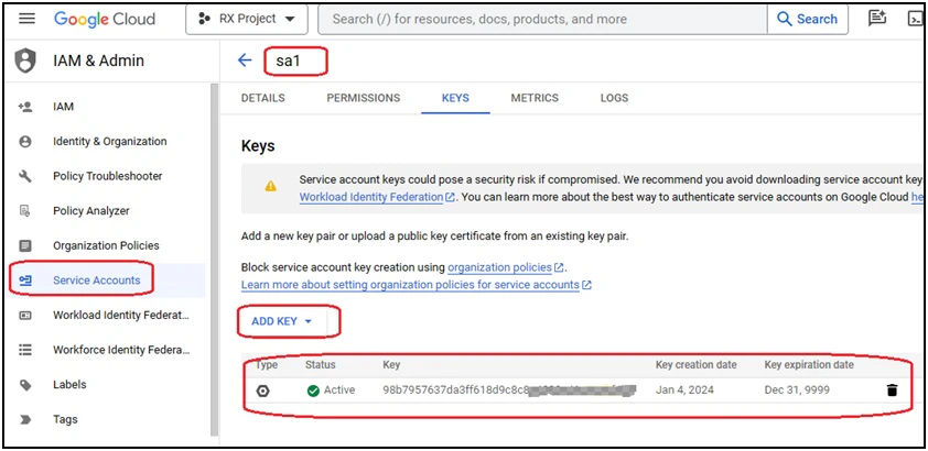 Create a service account (‘sa1’) without permissions, and add a key for the service account. Download the key’s JSON file and securely keep it in a safe location.
