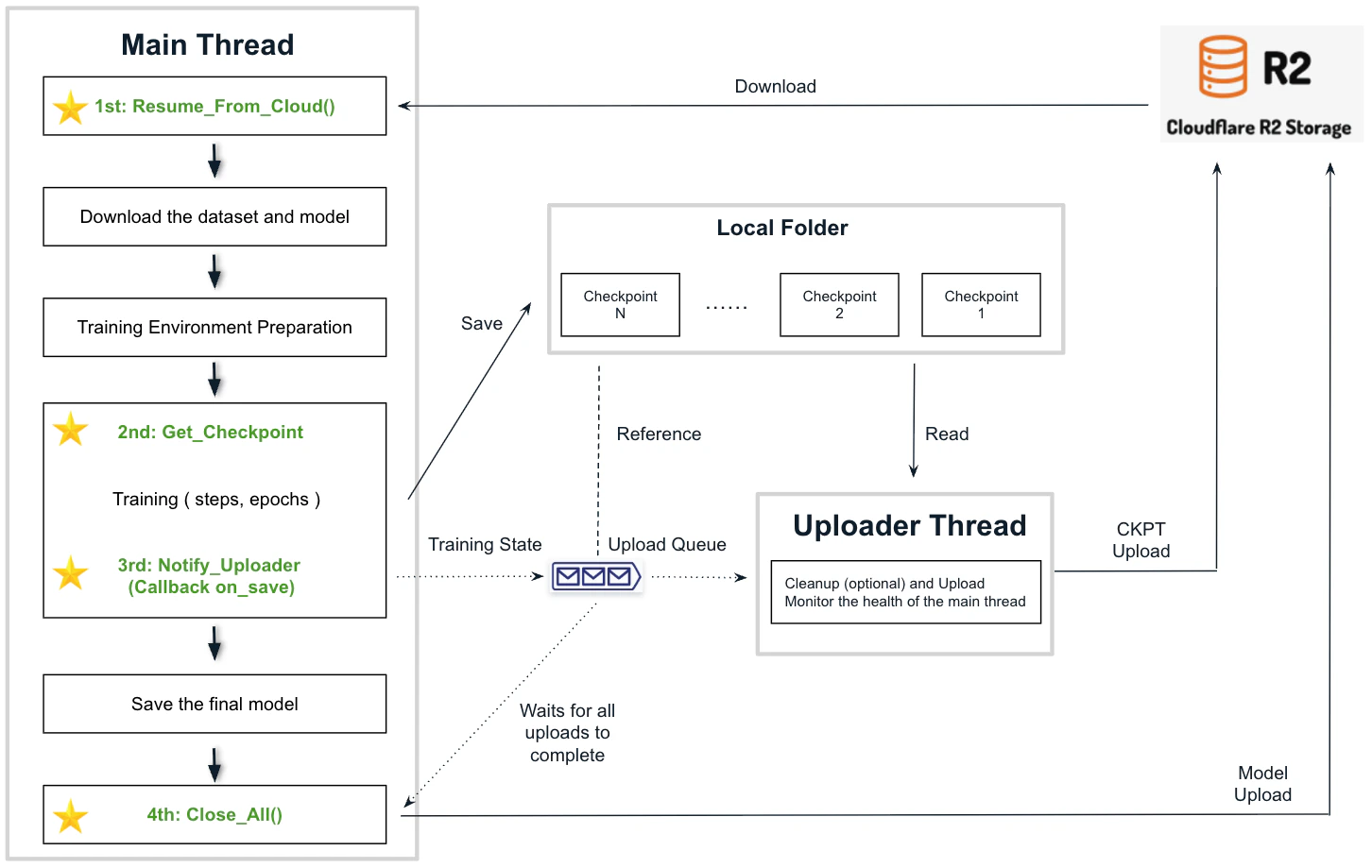 With the provided helper.py—a lightweight 400-line module that handles background data synchronization-you only need 4 small code changes, adding just 6 lines to make ft-normal.py fully compatible with SaladCloud. See ft-interruptible.py for a complete reference.