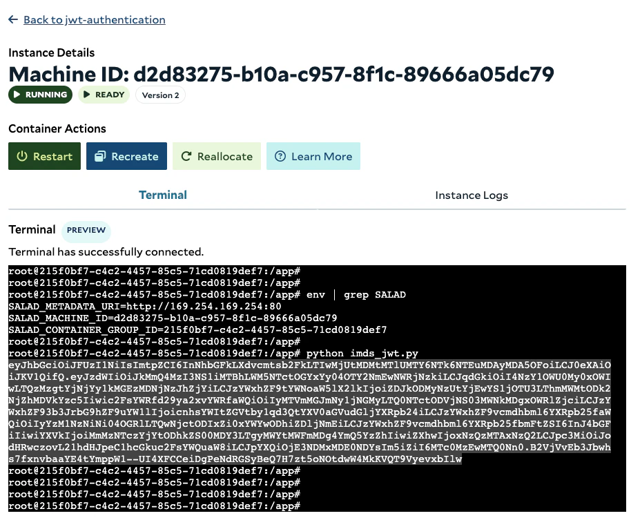 Each Salad node can be issued a JWT that contains essential metadata, including details like salad_machine_id, salad_organization_name, and other relevant information. The JWT expires after 5 minutes, with a new one automatically issued before expiration. The SaladCloud Instance Metadata Service (IMDS) enables applications running on Salad nodes to securely query essential information and manage configurations. The IMDS is available at the non-routable IPv4 address 169.254.169.254 on port 80 of each Salad node, and applications running locally can call the service to check health status, trigger node reallocation, and retrieve the JWT. Note: Applications must bypass any proxies (such as SOCK5 and HTTP) when making requests to the IMDS. Below is an example code of how to retrieve the JWT using the SaladCloud IMDS Python SDK. For more details on obtaining the JWT in different programming languages, please refer to the guide.imds_jwt.py