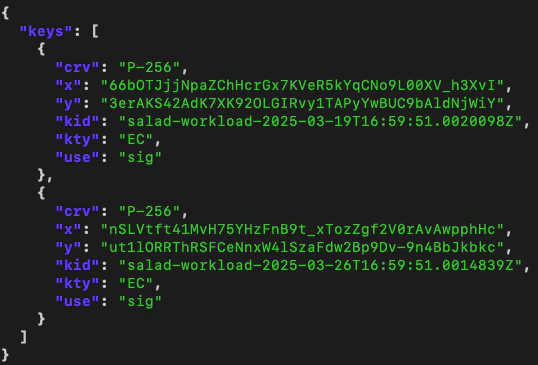 The JWKS on SaladCloud can be accessed through the JWKS Endpoint. You can retrieve and inspect it using the following command: